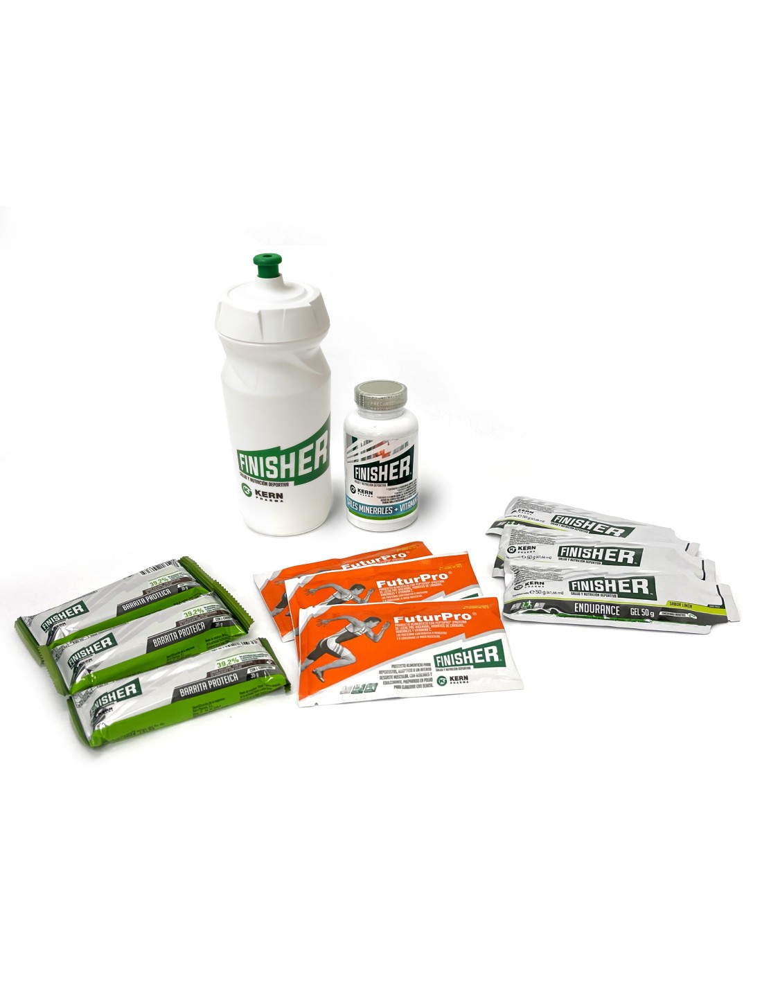 Pack Mussara de Finisher compuesto por BIDÓN FINISHER OFICIAL, FINISHER SALES MINERALES + VITAMINAS, 3 SOBRES FINISHER ENDURANCE, 3 SOBRES FINISHER FUTURPRO, 3 BARRITAS FINISHER PROTÉICAS SABOR AVELLANA CON COBERTURA DE CHOCOLATE CON LECHE